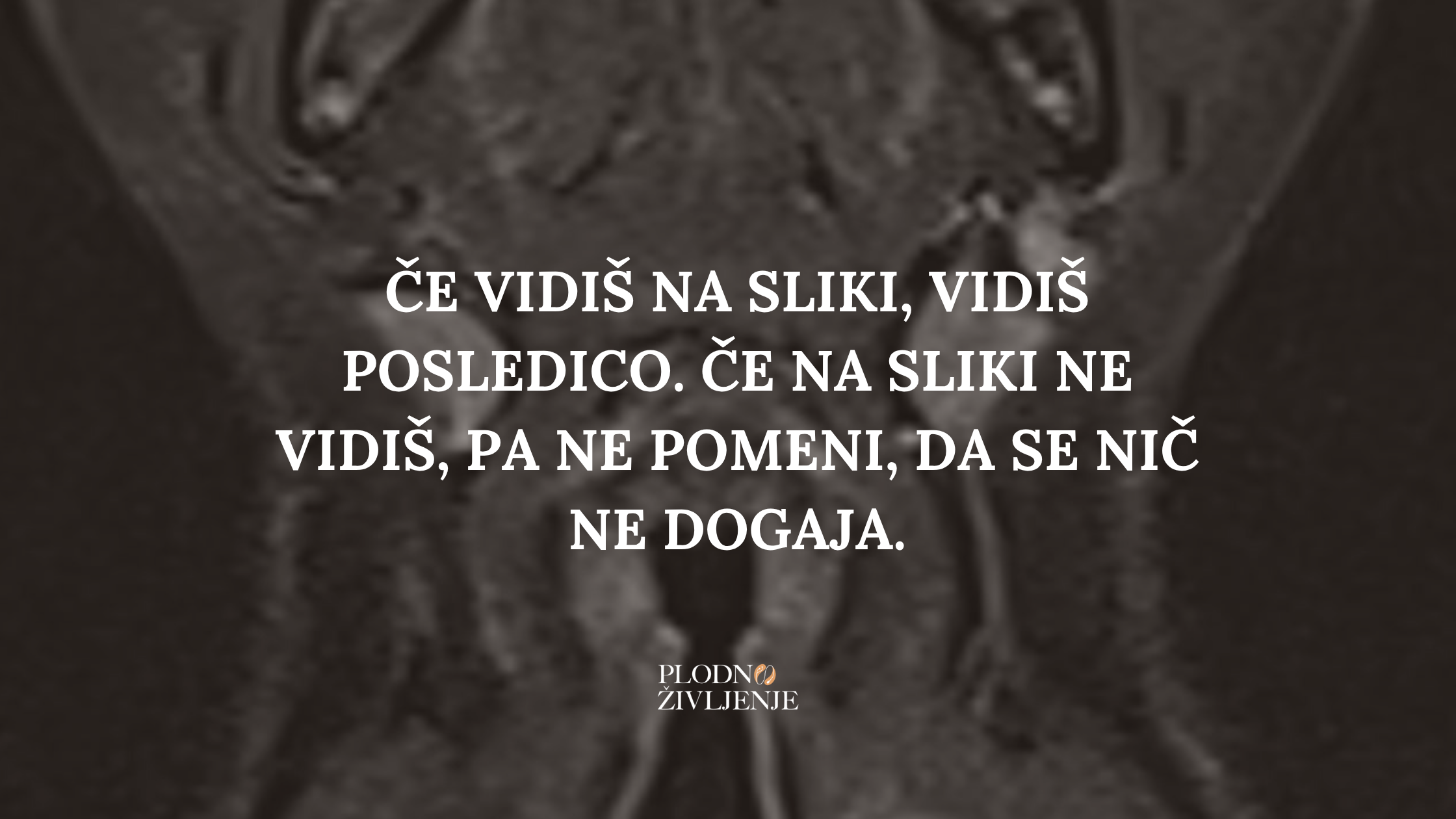 Tukaj je meni postalo vedno bolj jasno, da slika pokaže posledico, ne pokaže pa tistega pravega vzroka. Naj ti povem na primeru: žolčni kamen je morda vzrok za akutno nastalo zaporo in bolečino pod desnim rebrnim lokom, a vzrok za nastanek samega kamna je drugje. Je v šibkih jetrih in pred tem neuravnoteženem želodcu in njegovi sluznici … Pred vsako vidno strukturno spremembo, kot je na primer ta kamen, se sprememba začne dogajati na celični ravni in v funkciji. In to je vzrok, zakaj tebe morda boli, tišči, napihuje … jaz pa kot zdravnik na sliki ne vidim nič.